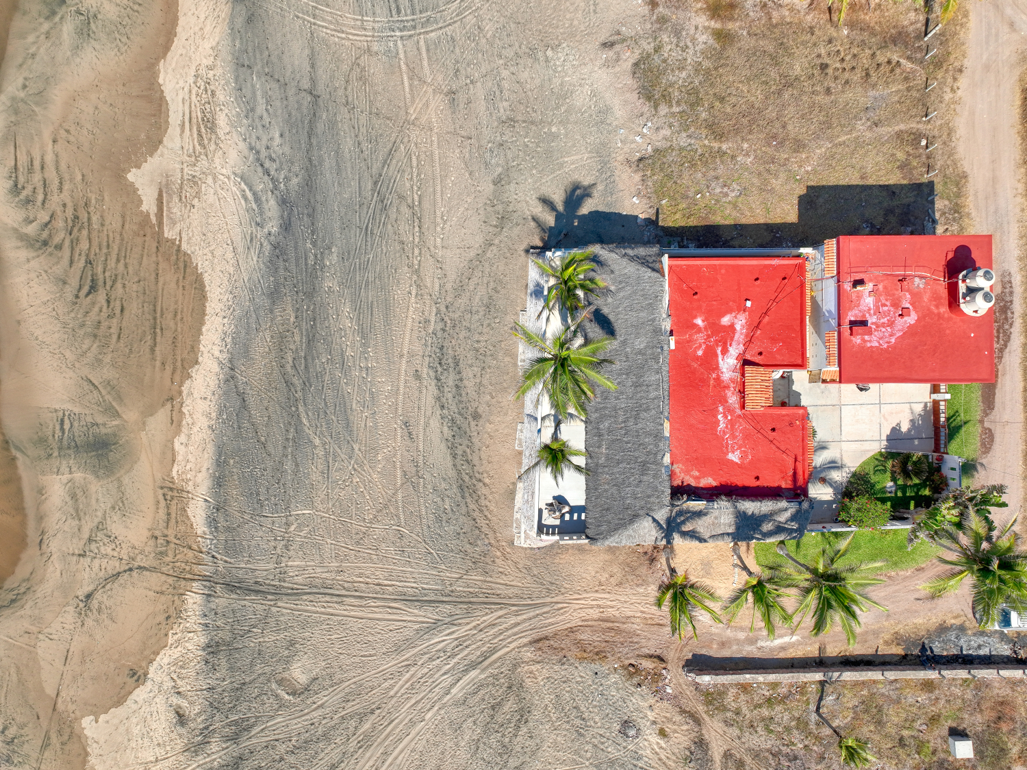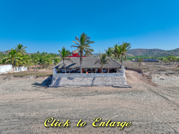 The house sits on 551 m2 of land and consists of two buildings, the first bulding is the main house which is one story and consists of two bedrooms with full bathroom and closet each one, a huge kitchen, dinner area, living room, laundry room, outside full bathroom and a huge palapa terrace in all the oceanfront side; the other bulding is two story and the first floor consist of a big garage with apace to parking two cars and space for storage tings, the second level consist of two bungalows each one with kitchen, dinner area, living room, full bathroom and bedroom; the soutside bungalow has sunrise view and the other has sunset view; there area a small garden in the patio and all the other part of the patio is covered with concrete floor; the property only has one neighbor property because in one front is the beach and the other two are street fronts; at just 10 meters south side of it property start the new resort under developement of El Tecuan property.