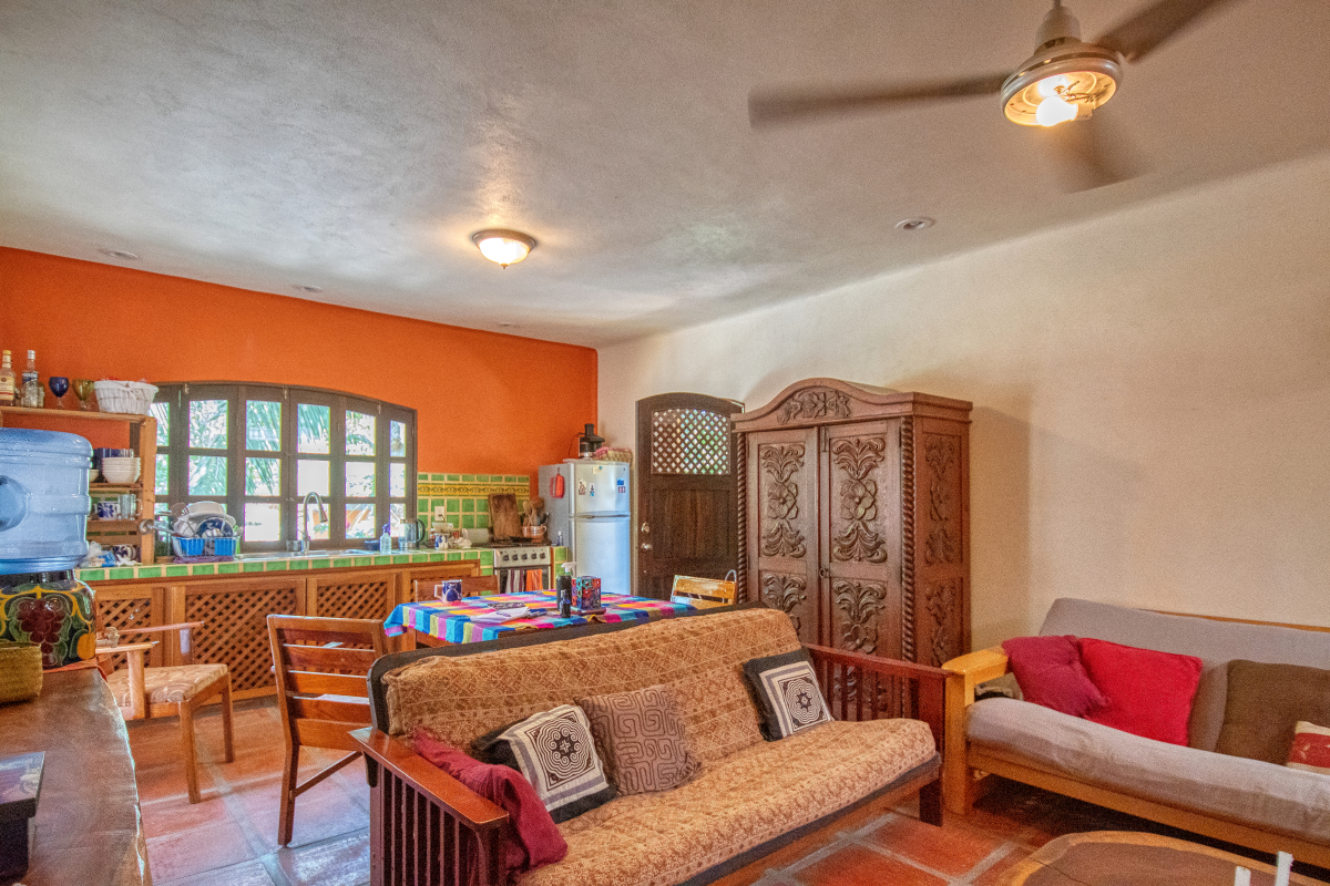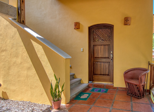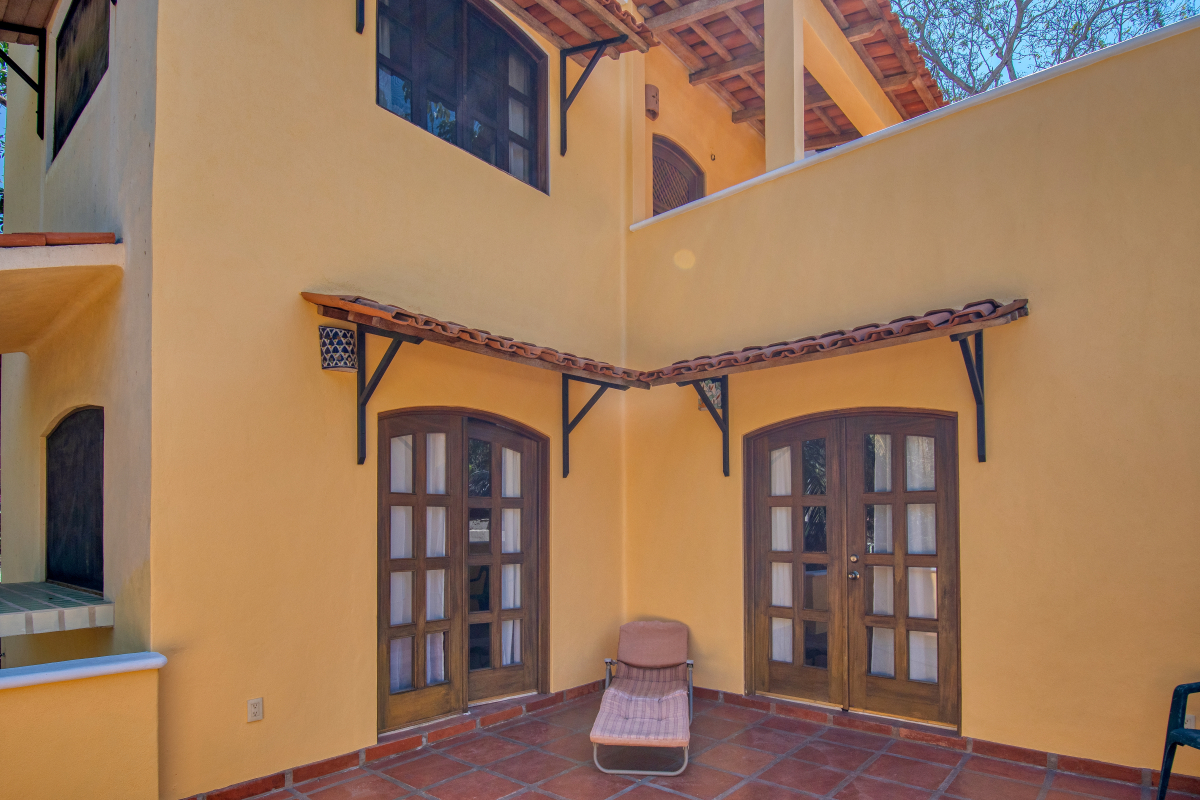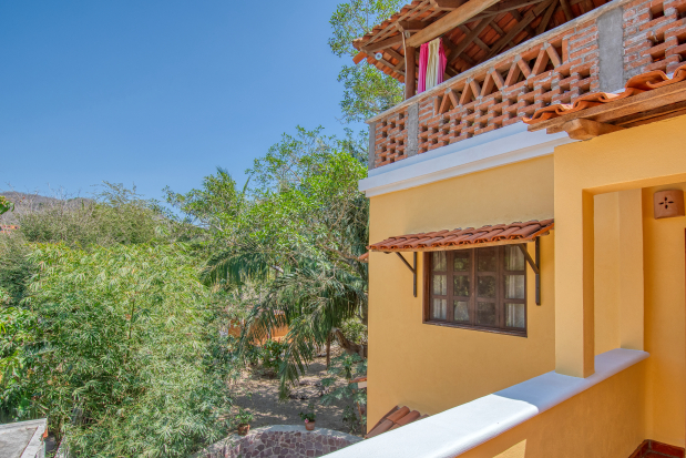 Approaching Casa Topacio you'll know you've arrived when you get to a fence line of multicolored bougainvilleas leading to the arched entrada of Casa Topacio .Passing through the archway , you'll no doubt notice the imposing Higuera , a wild fig tree , supporting enormous palapa fronds of the palm that it grew from as many as 150 years ago . Looking forward , the three story Casa Topacio , painted a brilliant yellow , stands before you . You'll see the sheltered outdoor staircase leading to the second floor, making Casa Topacio ideal as a single family home, with possibly two cooks in the family , or as a rental , the owner living in one part and renting the other , or renting both parts.