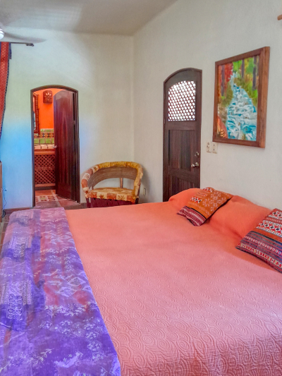 Returning inside through the other set of French doors, you'll find a spacious , well lit bedroom , graced additionally with a small cathedral window , protected by vine like ironwork . Circling back into the living room gives access to the bathroom , painted brilliant turquoise , with parota wood cabinet doors, as are all the doors of the casa . Herein the traditional Mexican shower is of white and blue tilework , detailed with design azulejos ; an incentive to sing in the shower !