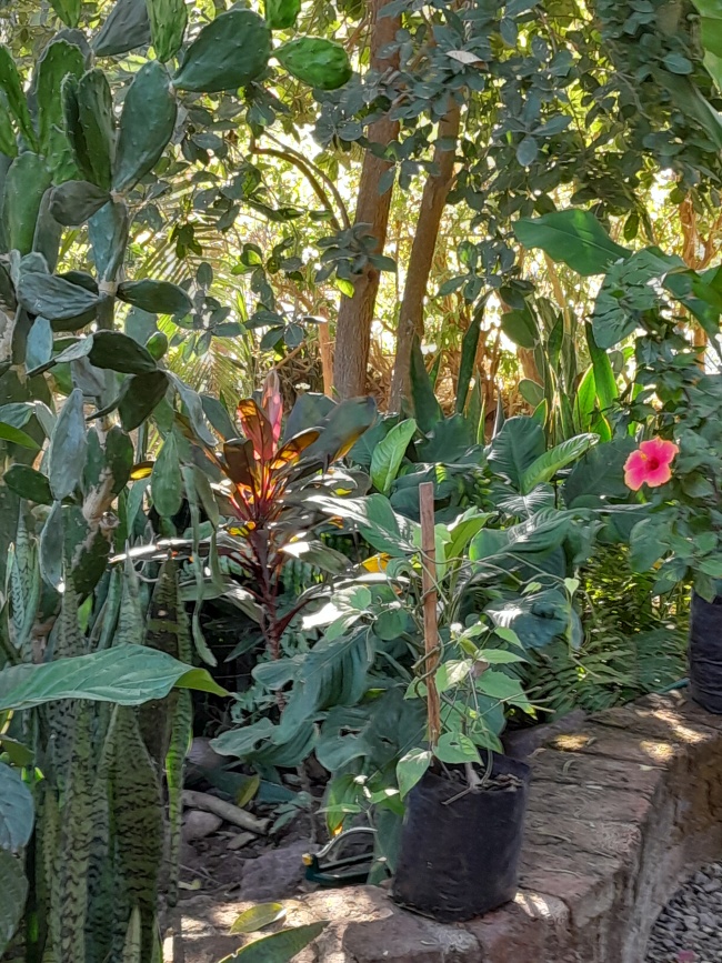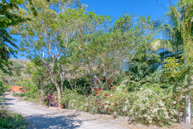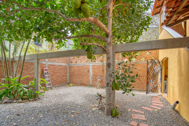 The porch for the staircase is shared with the first floor entry. Enjoying your morning coffee on this porch , you might look out into the tall brick walled courtyard , up to the huge jackfruit hanging from the tree , or down onto the tiered rock jungle garden descending to the base of the Higuera and Palm trees, or you might prefer the private patio , accessible through the set of arched French doors from the kitchen area of the first floor dwelling . This also looks out on the junglesque environment , as do all the windows of the house . Also present on this almost double sized property is a plethora of other trees : Tamarindo , Almendra , Bamboo , Guayaba , Neem , Jack Fruit , Moringas , Capulins , Primaveras, and Palms .
